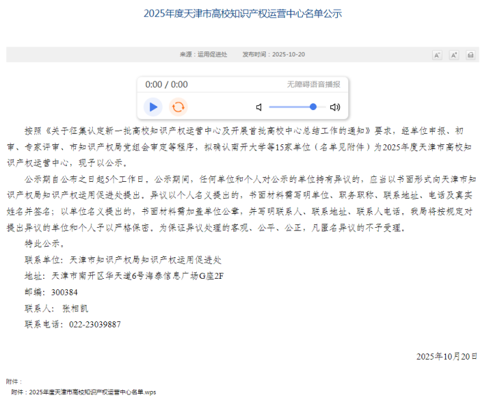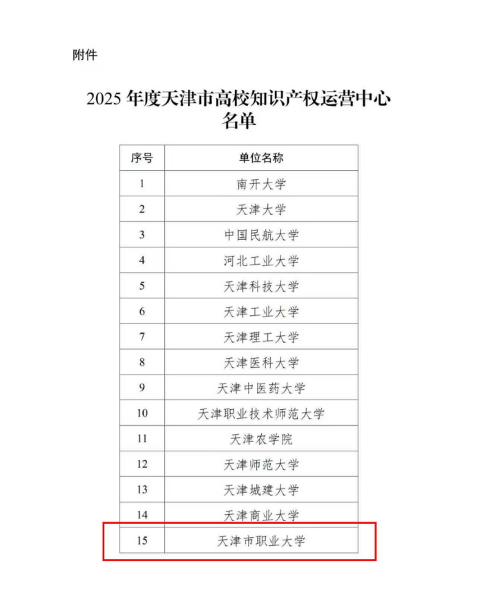 近日,天津市知识产权局公示了2025年度天津市高校知识产权运营中心建设名单,共有15所高校获得批准。2023年认定了首批11家天津市高校知识产权运营中心,本次新增了4所高校,我校作为唯一一所入选的高职院校成功获得该建设资质。这一里程碑式的突破,不仅是对我校科技创新与知识产权工作的高度认可,更是我校在“双高计划”高水平学校建设中取得的又一重大标志性成果。
